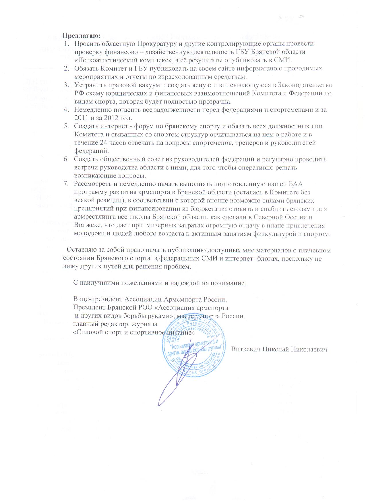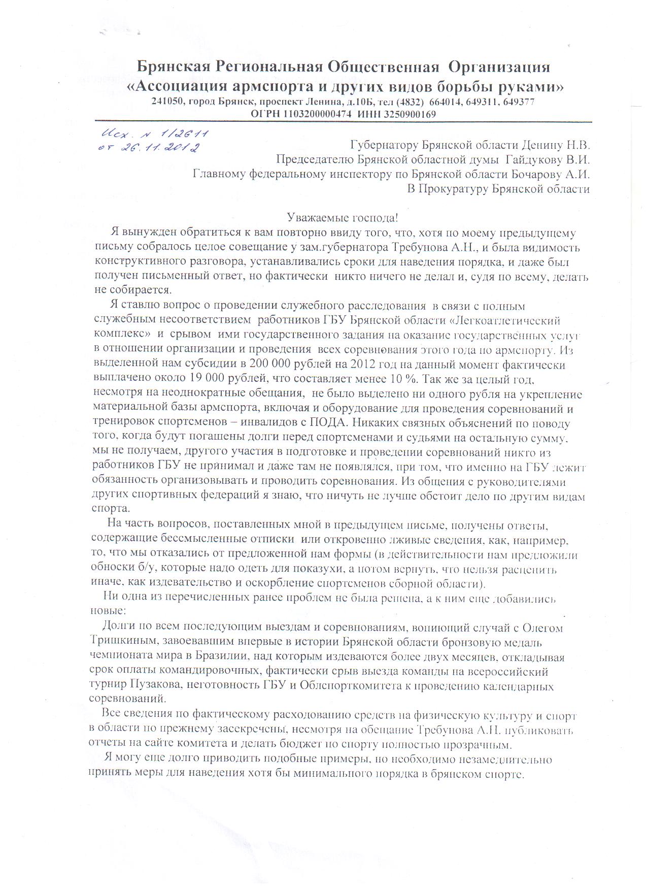 «Я ставлю вопрос о проведении служебного расследования в связи с полным служебным несоответствием работников ГБУ Брянской области «Легкоатлетический комплекс» и срывом ими государственного задания на оказание государственных услуг в отношении организации и проведения всех соревнования этого года по армспорту. Из выделенной нам субсидии в 200 000 рублей на 2012 год на данный момент фактически выплачено около 19 000 рублей, что составляет менее 10 %. Так же за целый год, несмотря на неоднократные обещания, не было выделено ни одного рубля на укрепление материальной базы армспорта, включая и оборудование для проведения соревнований и тренировок спортсменов-инвалидов с ПОДА. Никаких связных объяснений по поводу того, когда будут погашены долги перед спортсменами и судьями на остальную сумму, мы не получаем, другого участия в подготовке и проведении соревнований никто из работников ГБУ не принимал и даже там не появлялся, при том, что именно на ГБУ лежит обязанность организовывать и проводить соревнования. Из общения с руководителями других спортивных федераций я знаю, что ничуть не лучше обстоит дело по другим видам спорта», — пишет президент Брянской ассоциации армспорта.